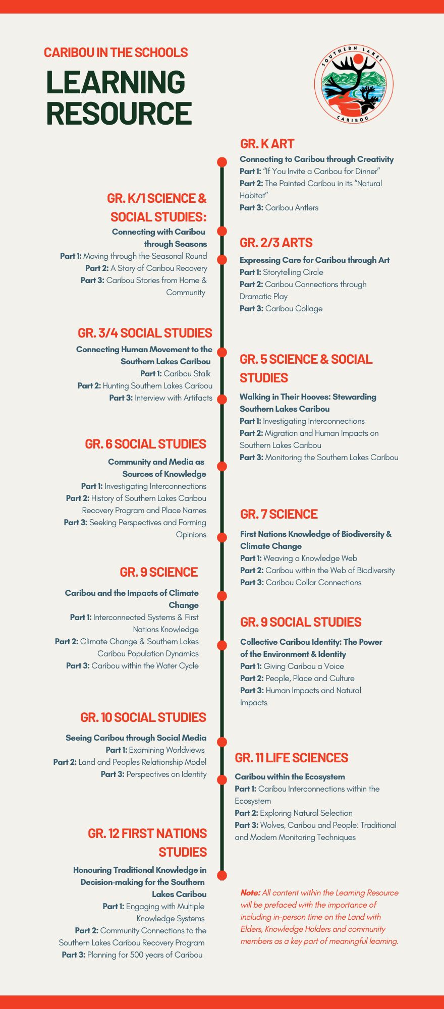 Caribou in the Schools invites educators and students to learn from the land, the caribou, and the Indigenous Knowledge Keepers who continue to guide their stewardship. Grounded in Indigenous-led education design, this resource explores the unique history and ongoing story of the Southern Lakes Caribou through caribou-focused, land-based learning. These experiences honour Indigenous knowledge systems and strengthen understanding of the deep relationships between people, animals, and place that continue to sustain the Southern Lakes region.